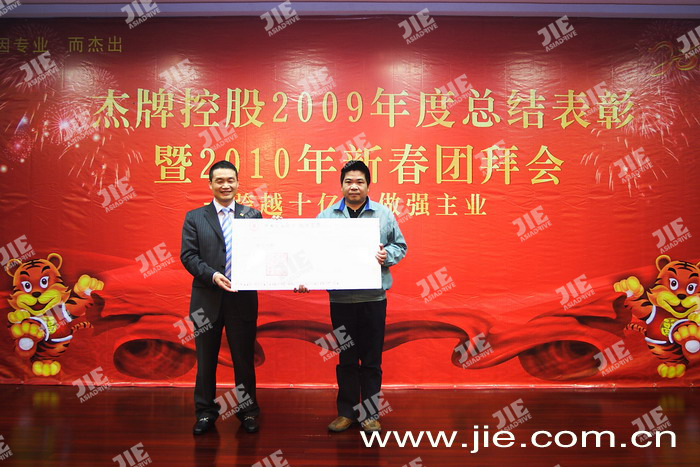 2010年02月10日,杰牌控股2009年度總結表彰暨2010年新春團拜會在蕭山航民賓館隆重舉行,在《杰牌之歌》的歌聲中拉開了杰牌控股2009年度總結表彰會的序幕,會議公布了2009年度“杰牌形象獎、杰牌業績獎、杰牌精英獎”得主。會上董事長&總裁陳德木先生作了2009年度工作報告,和邦咨詢嚴正老師為我們分享了《開創新局面-成就卓越績效,實現人生價值》的主題報告。通過活動,明確了公司2010年目標任務,鼓舞了全體員工的信心和士氣,為公司2010年目標任務的完成奠定了良好的思想基礎??偨Y表彰會后全體員工參加了新春團拜會,抽獎活動和各部門精彩的表演使團拜會掀起一陣陣高潮,最后在全體員工《杰牌之歌》的合唱聲中結束了杰牌控股2010年新春團拜會。